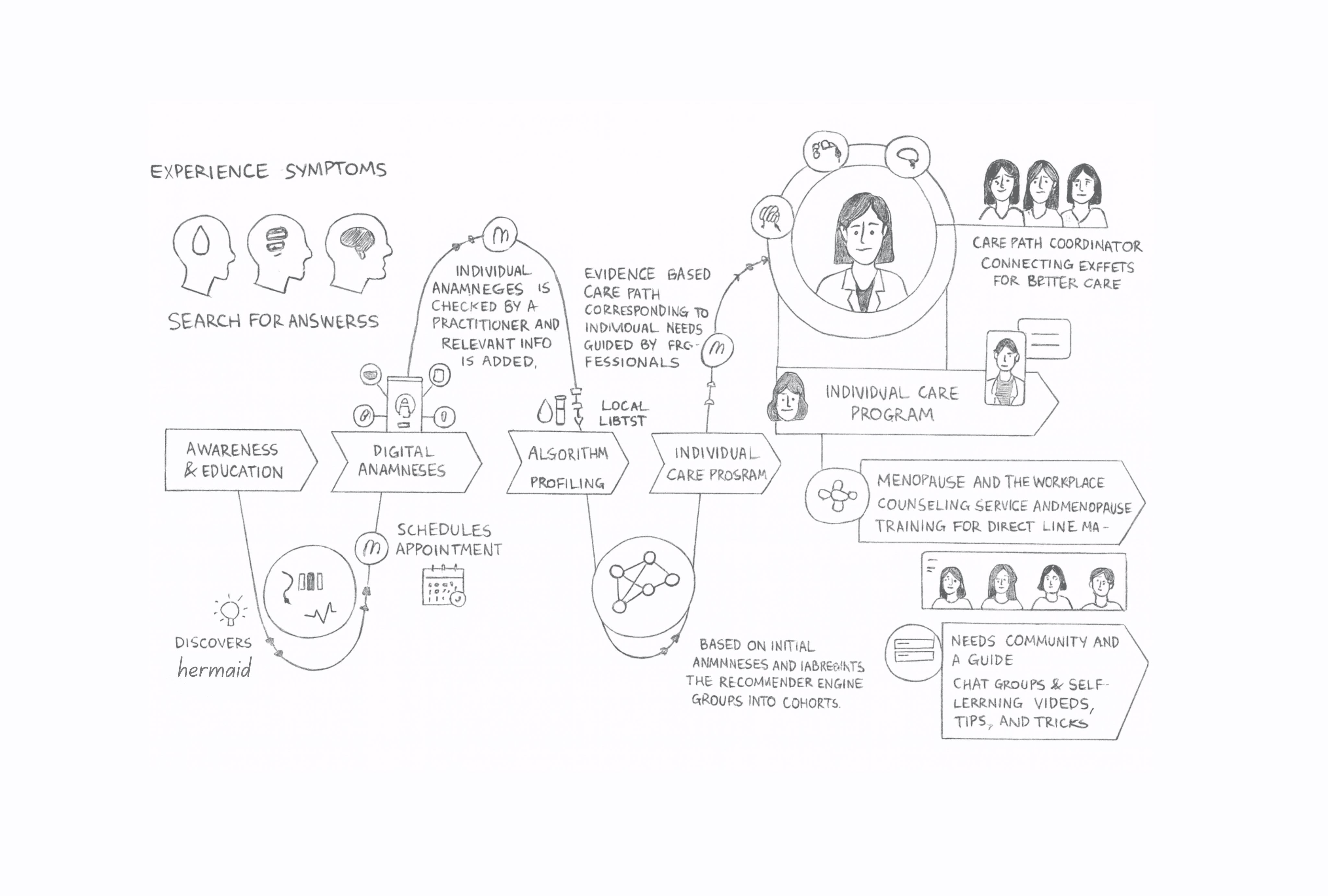 I designed Hermaid’s architecture as a modular framework that supports evolving use cases. Each user journey was mapped around clarity and context, from symptom exploration to personalised insights and educational resources.